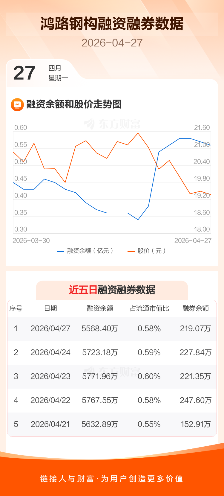 交易所最新数据显示,鸿路钢构于2026年4月27日获融资买入352.64万元,融资偿还507.42万元,当日融资净偿还154.78万元。目前,该股融资余额5568.40万,占流通市值比例为0.58%。