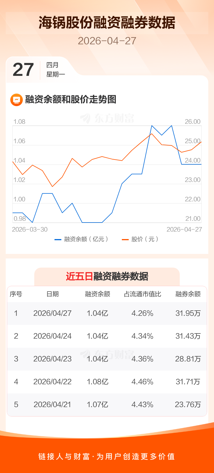 交易所最新数据显示,海锅股份于2026年4月27日获融资买入502.32万元,融资偿还526.59万元,当日融资净偿还24.26万元。目前,该股融资余额1.04亿,占流通市值比例为4.26%。