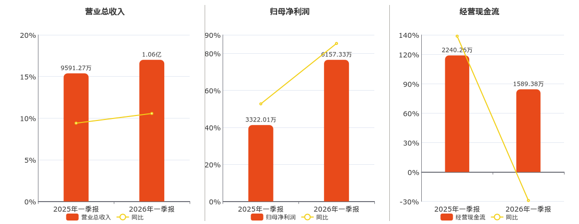 公司营业总收入为1.06亿元,在已披露的同业公司中排名第59。归母净利润为6157.33万元。经营活动现金净流入为1589.38万元,在已披露的同业公司中排名第42,较去年同报告期经营活动现金净流入减少650.89万元,同比较去年同期下降29.05%。