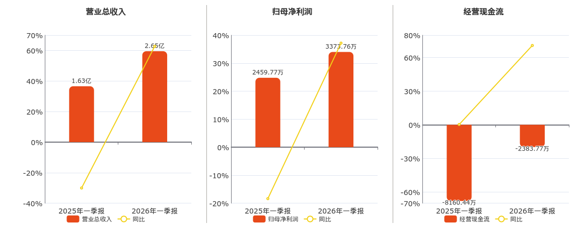公司营业总收入为2.65亿元。归母净利润为3373.76万元。经营活动现金净流入为-2383.77万元。