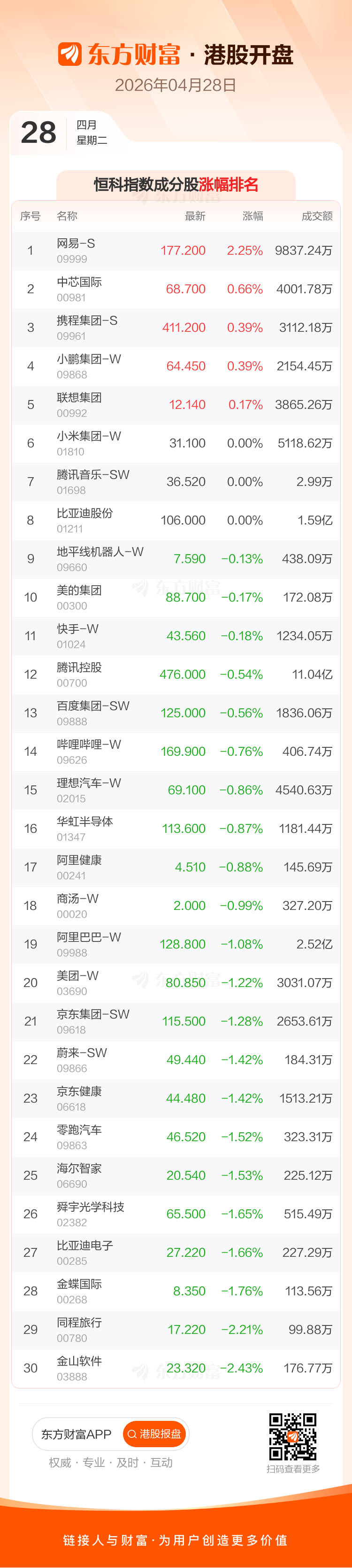 港股4月28日低开,恒生指数开盘报25814.37点,跌111.28点,跌幅0.43%;恒生科技指数开盘报4923.78点,跌16.06点,跌幅0.33%。恒生指数成分股中药明康德、网易-S、药明生物涨幅居前,宁德时代、中国宏桥、洛阳钼业跌幅靠前。恒生科技指数成分股中网易-S、中芯国际、携程集团-S涨幅居前,金山软件、同程旅行、金蝶国际跌幅靠前。
