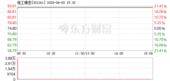 4月28日9点30分,恒工精密开盘涨停,报89.76元,目前封单42658手,折合3.83亿元。截至目前,成交2.13亿元,换手率6.35%。
