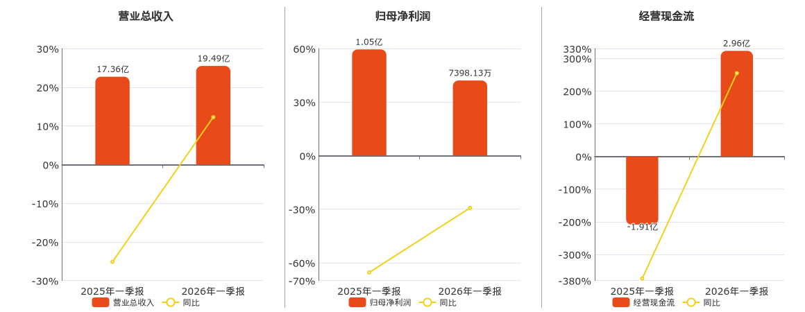 公司营业总收入为19.49亿元,在已披露的同业公司中排名第18,较去年同报告期营业总收入增加2.13亿元,同比较去年同期上涨12.26%。归母净利润为7398.13万元,在已披露的同业公司中排名第14,较去年同报告期归母净利润减少3062.45万元,同比较去年同期下降29.28%。经营活动现金净流入为2.96亿元,在已披露的同业公司中排名第14,较去年同报告期经营活动现金净流入增加4.87亿元。