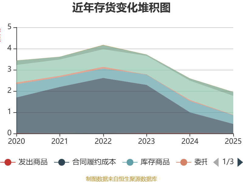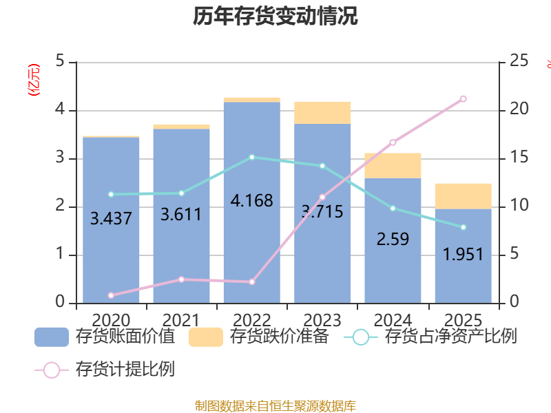 从存货变动来看,截至2025年末,公司存货账面价值为1.95亿元,占净资产的7.85%,较上年末减少6388.81万元。其中,存货跌价准备为5238.74万元,计提比例为21.17%。