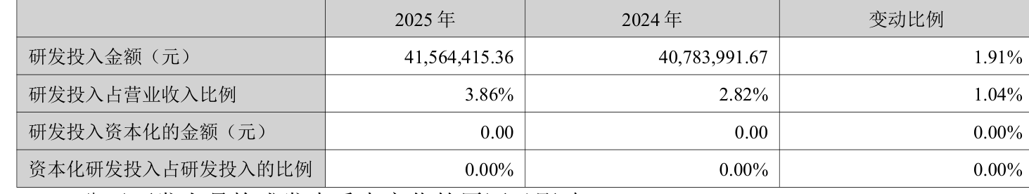 2025年全年,公司研发投入金额为4156.44万元,同比增长1.91%;研发投入占营业收入比例为3.86%,相比上年同期上升1.04个百分点。此外,公司全年研发投入资本化率为0%。