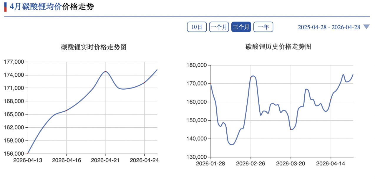 数据显示,2026年以来,锂产品价格大幅上涨。其中,今年1月,碳酸锂从月初11.9万元/吨上涨至月末15.25万元/吨,涨幅达28.15%;2月延续偏强态势,现货一度突破17万元/吨;3月电池级现货从每吨17万元上方回落至15万元附近。进入4月,碳酸锂价格再次回升至17.40万元/吨以上。
