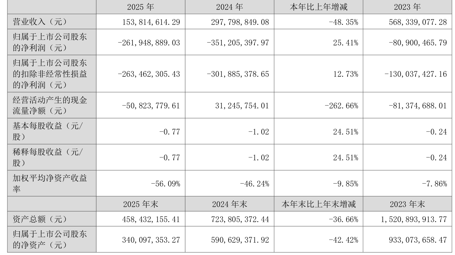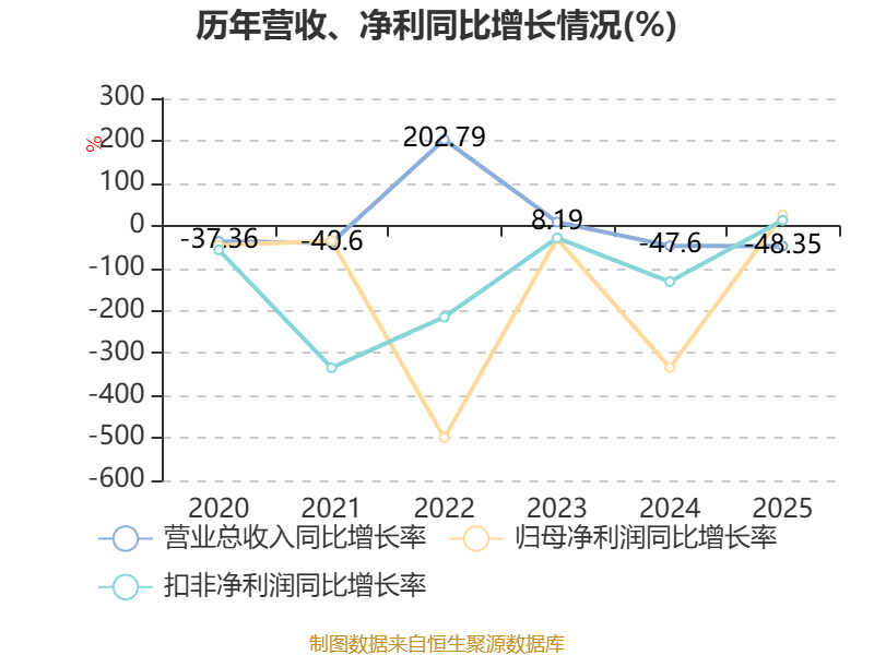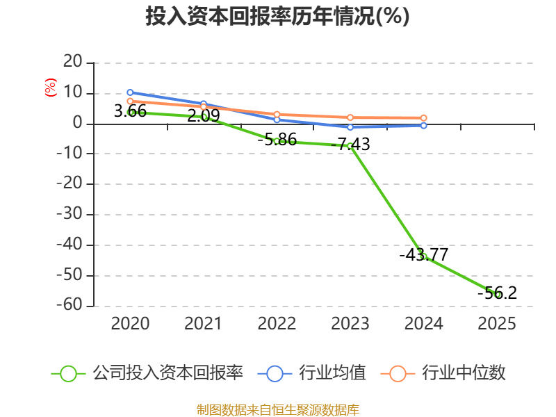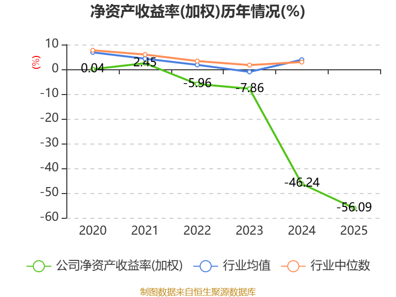 数据显示,2025年公司加权平均净资产收益率为-56.09%,较上年同期下降9.85个百分点。公司2025年投入资本回报率为-56.2%,较上年同期下降12.43个百分点。