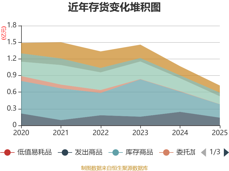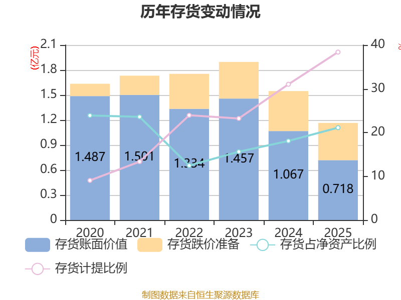 从存货变动来看,截至2025年末,公司存货账面价值为7180.11万元,占净资产的21.11%,较上年末减少3490.54万元。其中,存货跌价准备为4472.1万元,计提比例为38.38%。