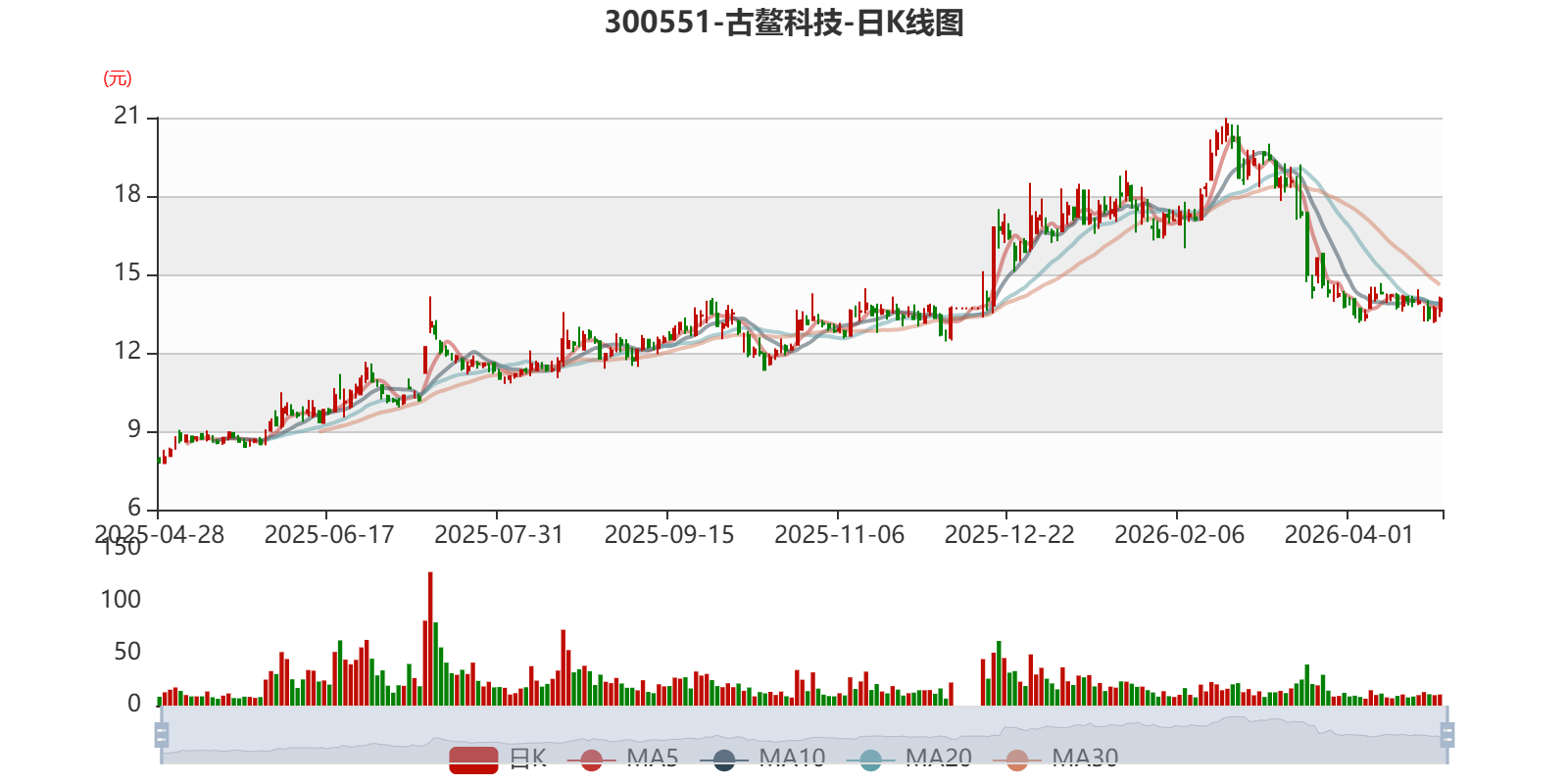 以4月27日收盘价计算,古鳌科技目前市盈率(TTM)约为-18.27倍,市净率(LF)约14.07倍,市销率(TTM)约31.11倍。