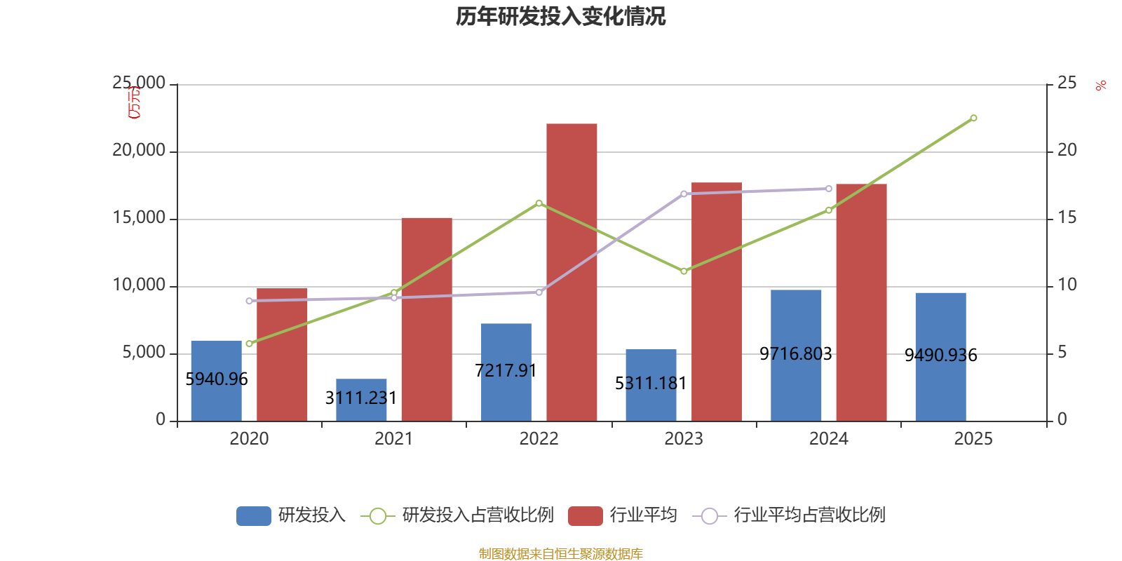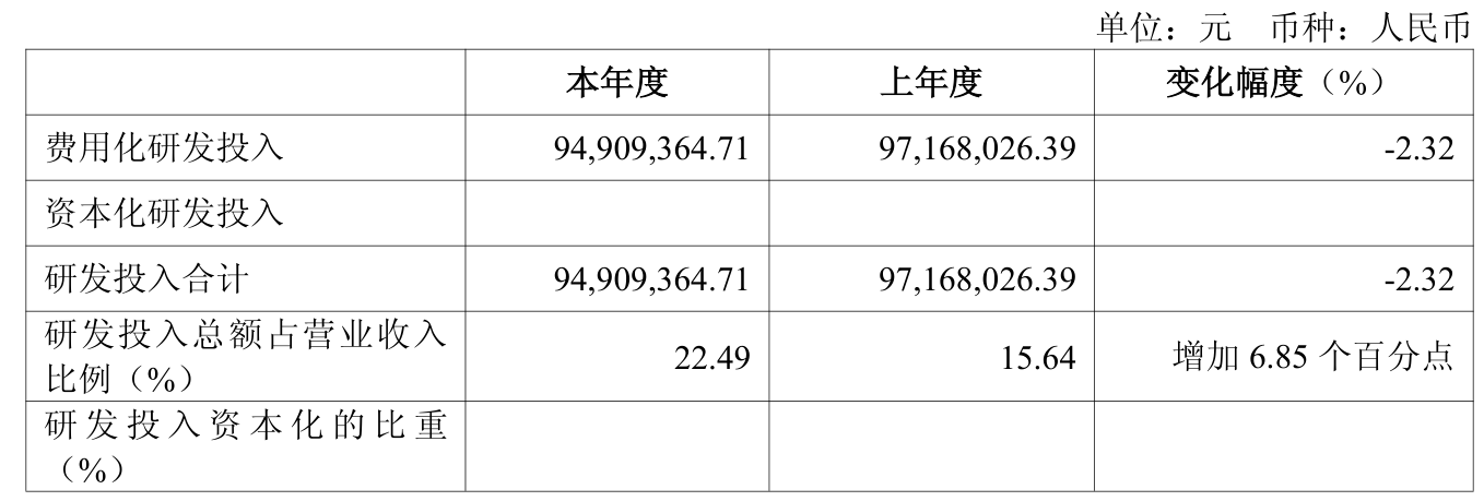 2025年全年,公司研发投入金额为9490.94万元,同比下降2.32%;研发投入占营业收入比例为22.49%,相比上年同期上升6.85个百分点。