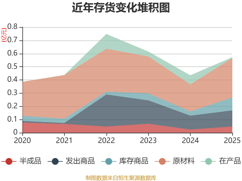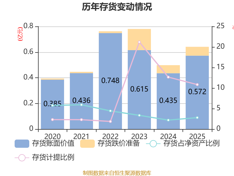 从存货变动来看,截至2025年末,公司存货账面价值为5717.52万元,占净资产的2.79%,较上年末增加1370.24万元。其中,存货跌价准备为694.3万元,计提比例为10.83%。