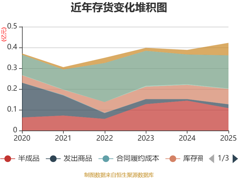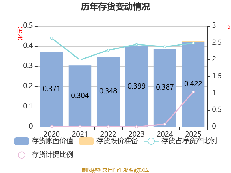 从存货变动来看,截至2025年末,公司存货账面价值为4220.75万元,占净资产的2.49%,较上年末增加346.98万元。其中,存货跌价准备为44.36万元,计提比例为1.04%。