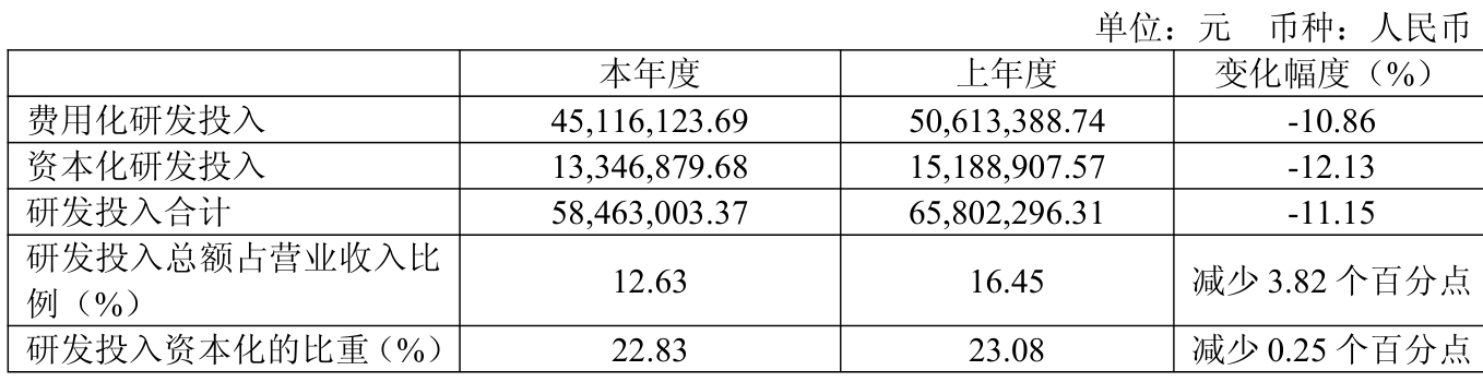 2025年全年,公司研发投入金额为5846.3万元,同比下降11.15%;研发投入占营业收入比例为12.63%,相比上年同期下降3.82个百分点。此外,公司全年研发投入资本化率为22.83%。