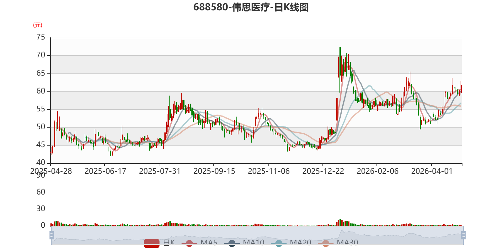 以4月27日收盘价计算,伟思医疗目前市盈率(TTM)约为42.78倍,市净率(LF)约3.49倍,市销率(TTM)约12.77倍。