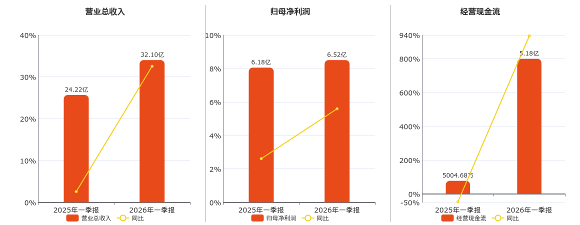 公司营业总收入为32.10亿元。归母净利润为6.52亿元。经营活动现金净流入为5.18亿元。