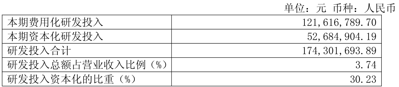 2025年全年,公司研发投入金额为1.74亿元,同比下降17.41%;研发投入占营业收入比例为3.74%,相比上年同期下降1.2个百分点。此外,公司全年研发投入资本化率为30.23%。