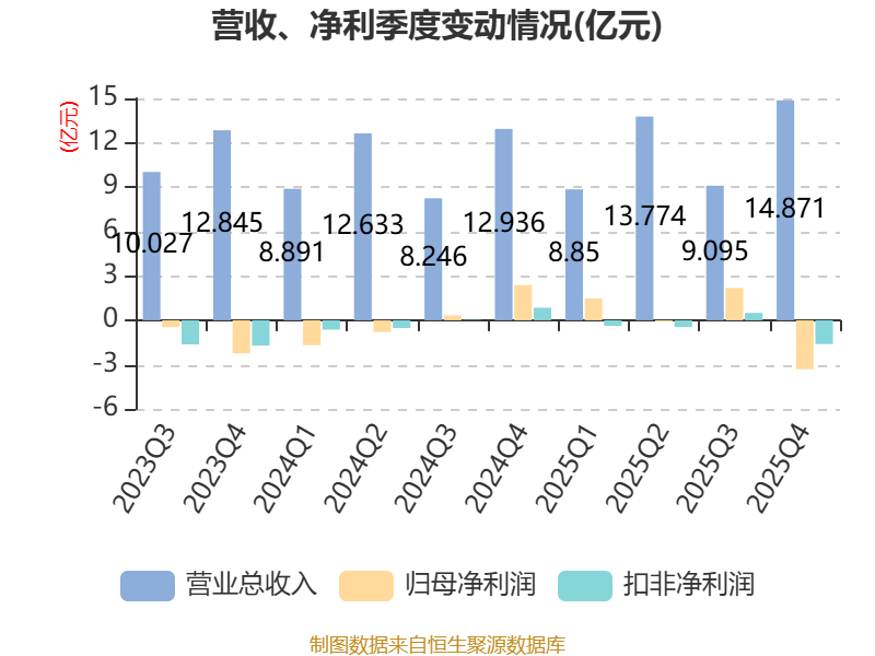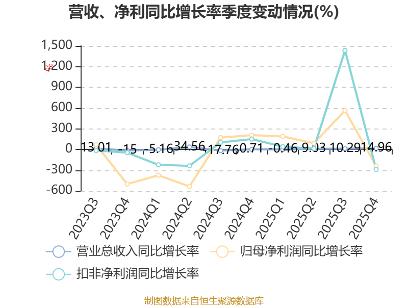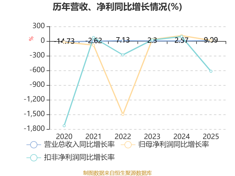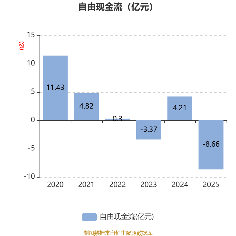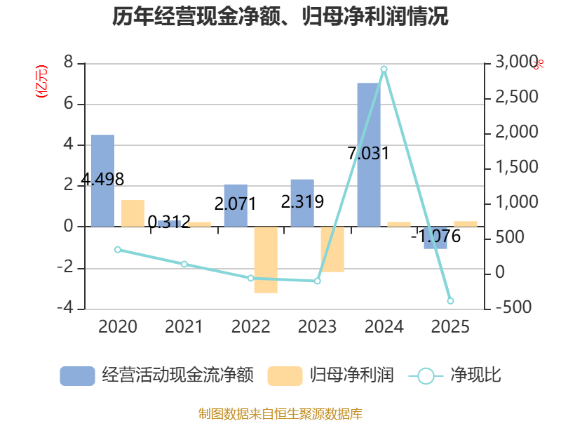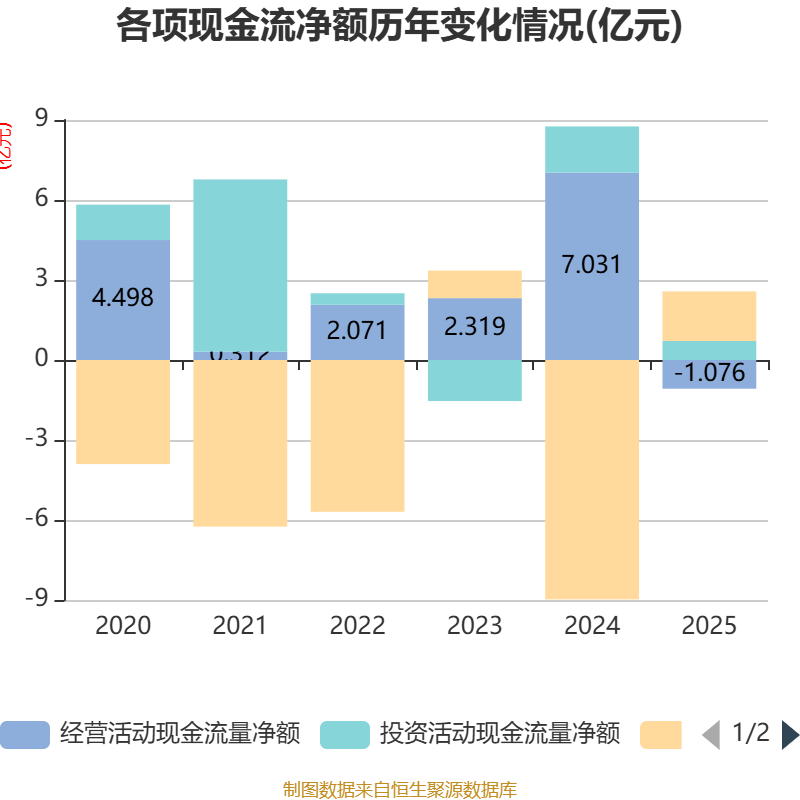 截至2025年,公司经营活动现金流净额为-1.08亿元,同比减少8.11亿元;筹资活动现金流净额1.86亿元,同比增加10.83亿元;投资活动现金流净额7144.14万元,上年同期为1.73亿元。