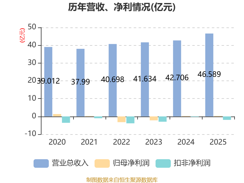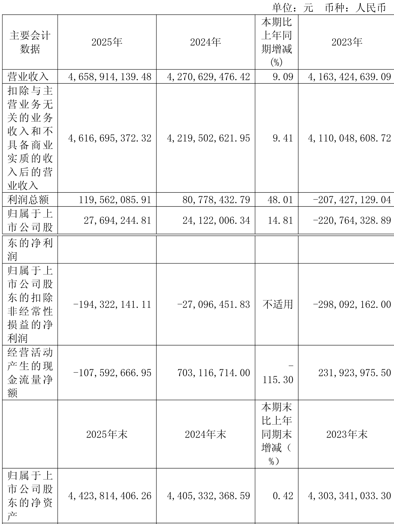中证智能财讯华胜天成(600410)4月28日披露2025年年度报告。2025年,公司实现营业总收入46.59亿元,同比增长9.09%;归母净利润2769.42万元,同比增长14.81%;扣非净利润亏损1.94亿元,上年同期亏损2709.65万元;经营活动产生的现金流量净额为-1.08亿元,上年同期为7.03亿元;报告期内,华胜天成基本每股收益为0.0253元,加权平均净资产收益率为0.63%。公司2025年度分配预案为:拟向全体股东每10股派现0.0758元(含税)。