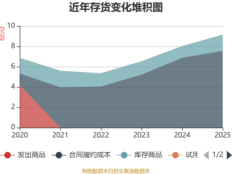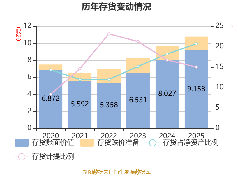 从存货变动来看,截至2025年末,公司存货账面价值为9.16亿元,占净资产的20.7%,较上年末增加1.13亿元。其中,存货跌价准备为1.62亿元,计提比例为15.03%。