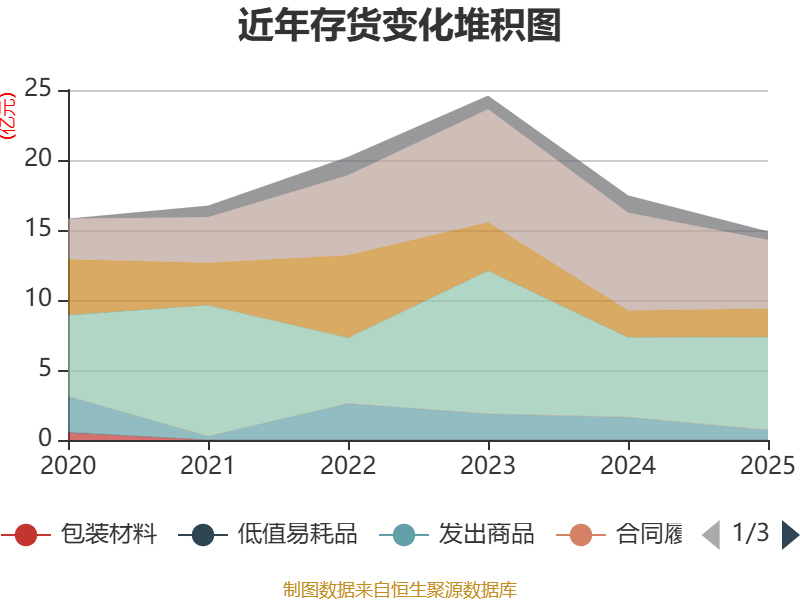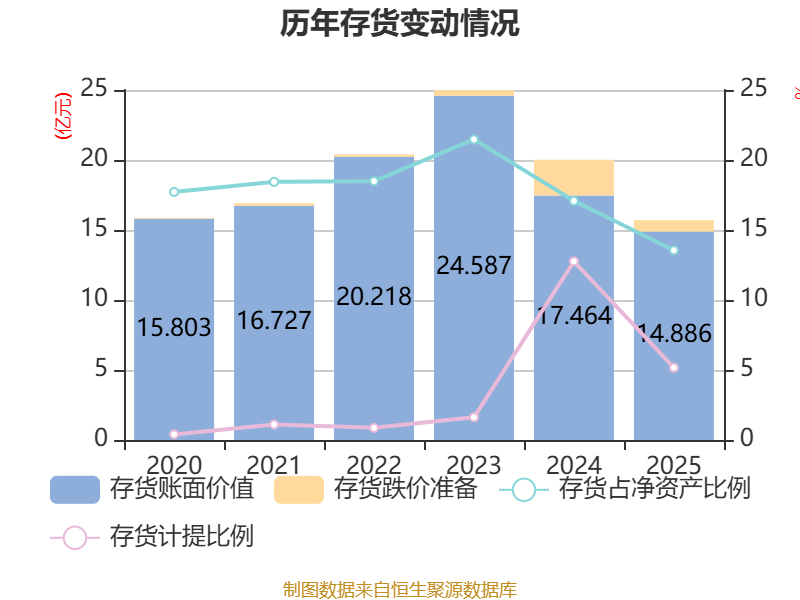 从存货变动来看,截至2025年末,公司存货账面价值为14.89亿元,占净资产的13.55%,较上年末减少2.58亿元。其中,存货跌价准备为8114.12万元,计提比例为5.17%。