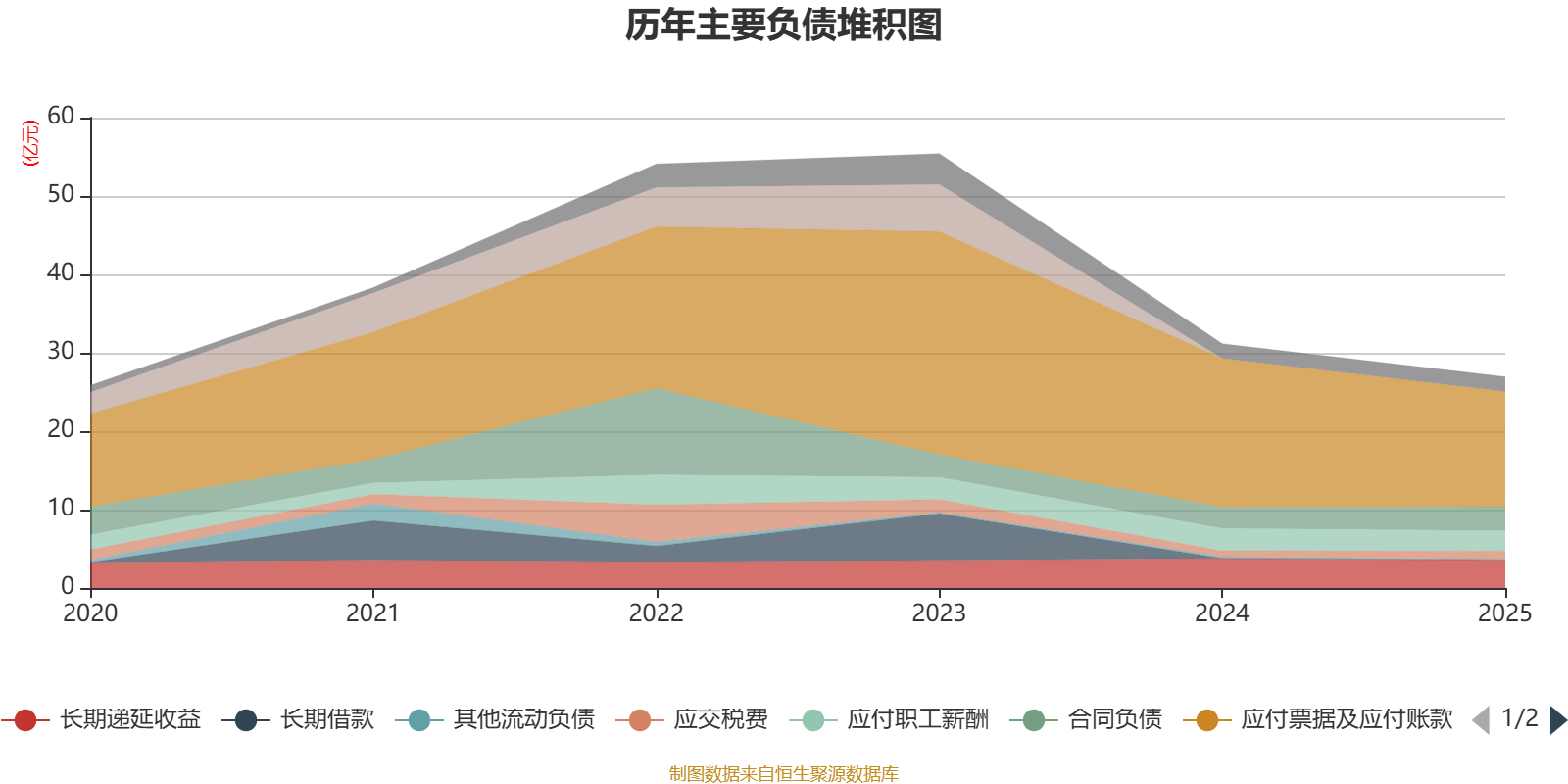 负债重大变化方面,截至2025年末,公司应付票据及应付账款较上年末减少22.58%,占公司总资产比重下降3.5个百分点;应付职工薪酬较上年末减少8.62%,占公司总资产比重下降0.23个百分点;长期递延收益较上年末减少4.81%,占公司总资产比重下降0.21个百分点;合同负债较上年末增加12.27%,占公司总资产比重上升0.19个百分点。