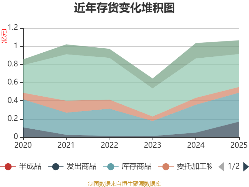 从存货变动来看,截至2025年末,公司存货账面价值为1.06亿元,占净资产的23%,较上年末增加301.76万元。其中,存货跌价准备为1092.13万元,计提比例为9.31%。