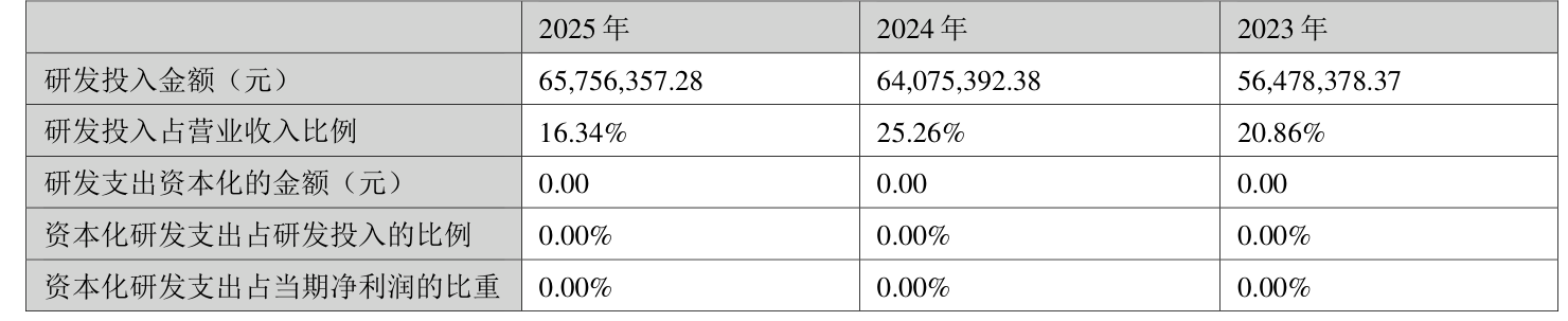 2025年全年,公司研发投入金额为6575.64万元,同比增长2.62%;研发投入占营业收入比例为16.34%,相比上年同期下降8.92个百分点。此外,公司全年研发投入资本化率为0%。