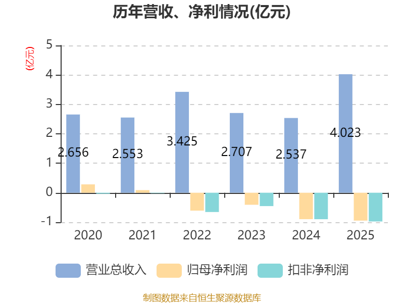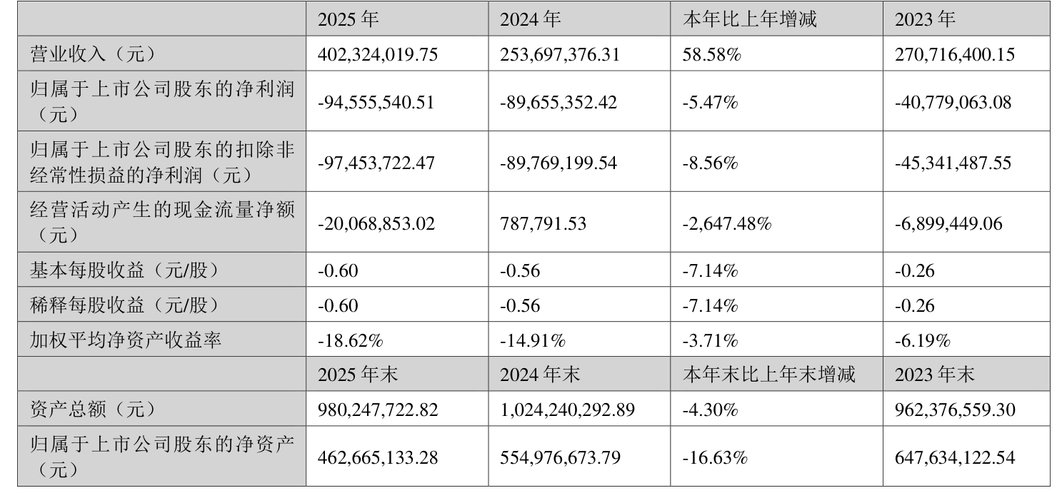 中证智能财讯英可瑞(300713)4月28日披露2025年年度报告。2025年,公司实现营业总收入4.02亿元,同比增长58.58%;归母净利润亏损9455.55万元,上年同期亏损8965.54万元;扣非净利润亏损9745.37万元,上年同期亏损8976.92万元;经营活动产生的现金流量净额为-2006.89万元,上年同期为78.78万元;报告期内,英可瑞基本每股收益为-0.6元,加权平均净资产收益率为-18.62%。