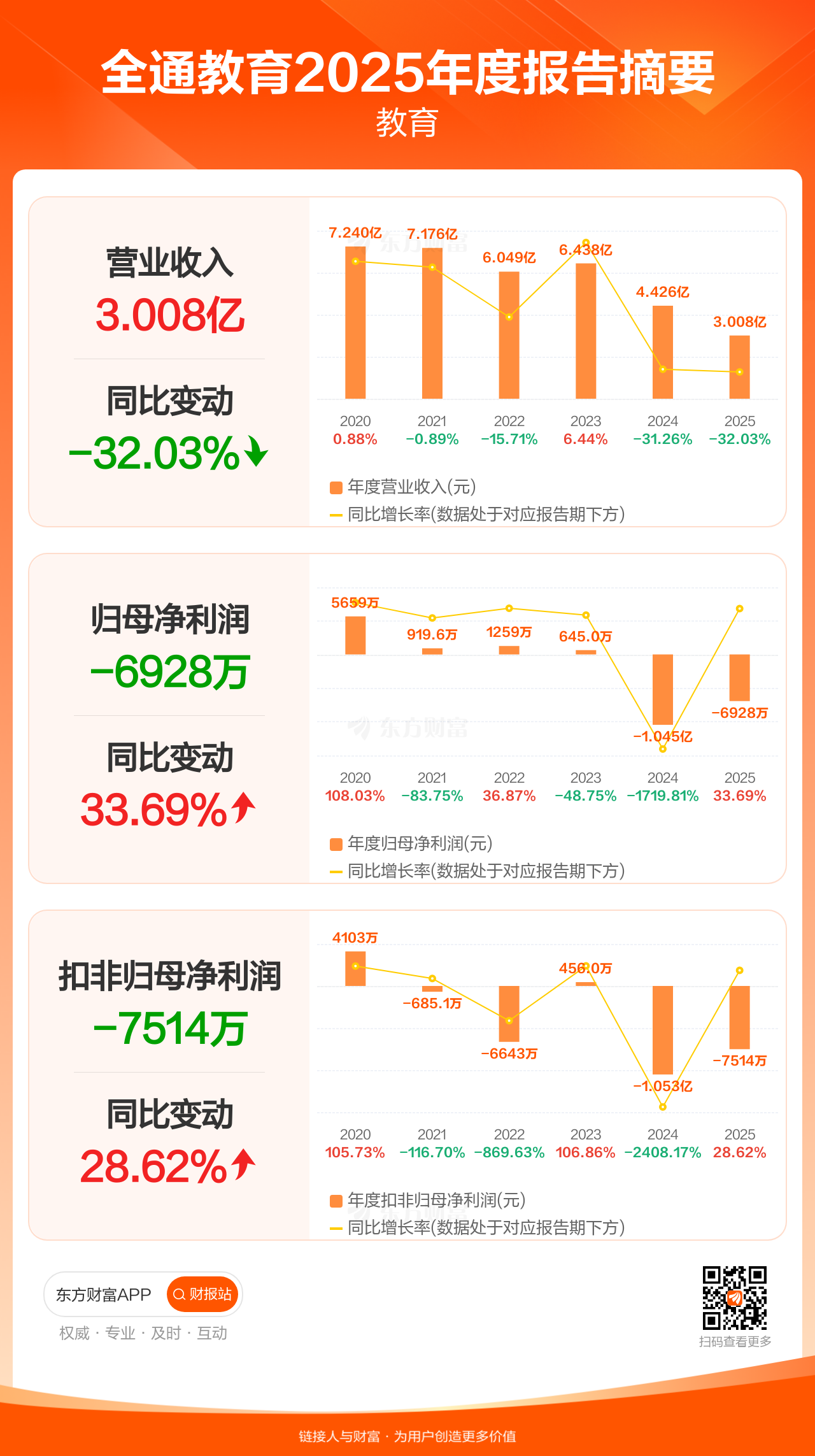全通教育4月29日发布2025年年报显示,公司全年实现营业收入3.01亿元,同比下滑32.03%;归母净利润-6928.31万元;扣非归母净利润-7513.79万元。