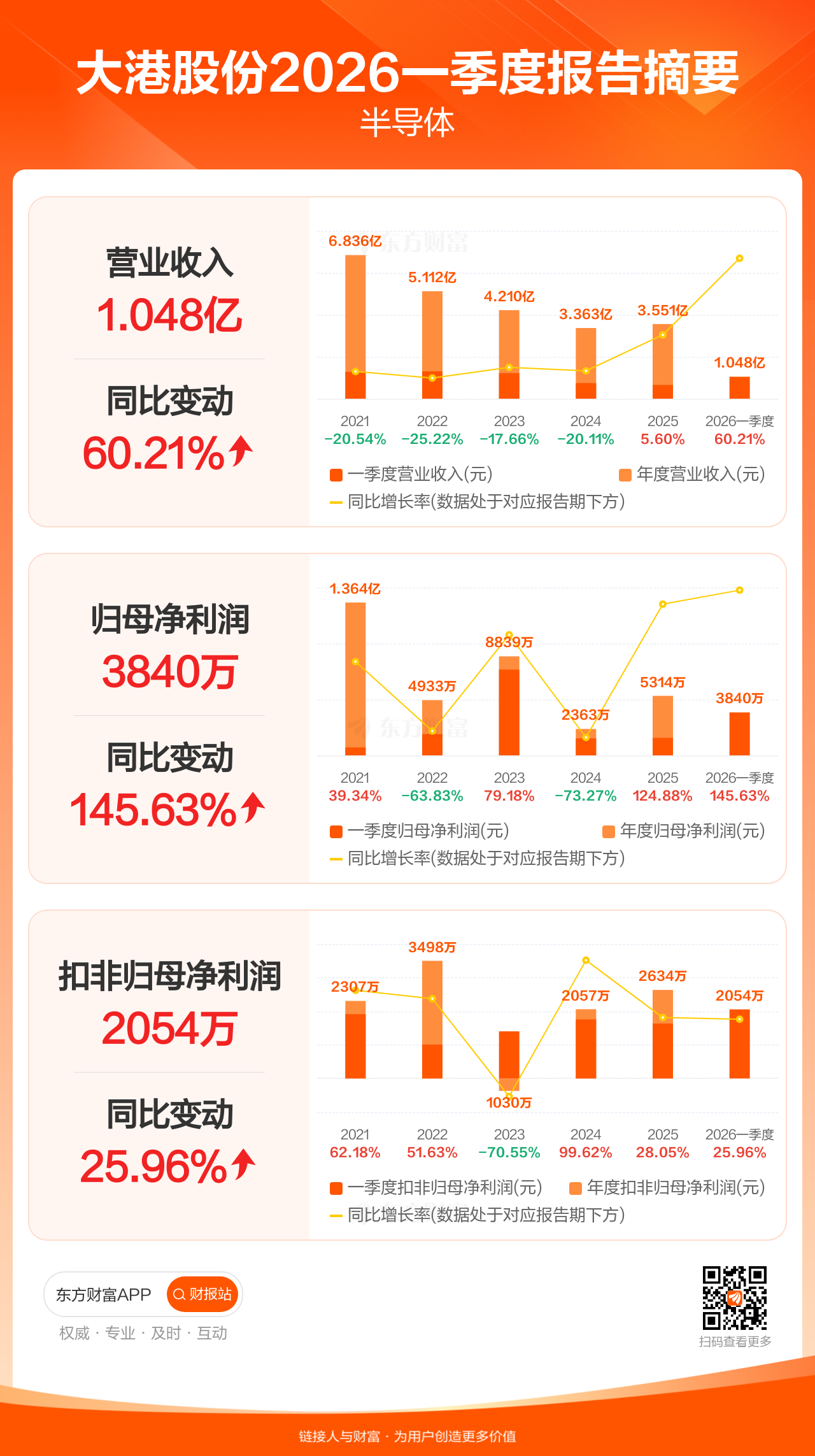 大港股份4月29日发布2026年一季报显示,公司一季度实现营业收入1.05亿元,同比增长60.21%;归母净利润3840.30万元,同比增长145.63%;扣非归母净利润2054.19万元,同比增长25.96%。