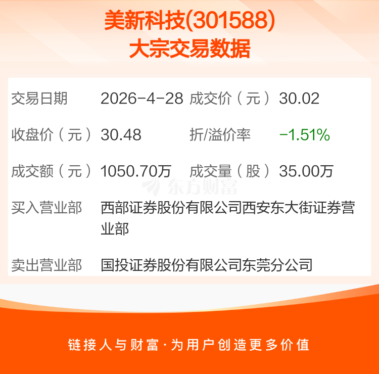 2026年4月28日,美新科技发生1笔大宗交易,共成交35.00万股,成交金额1050.70万元,占其流通市值比例为0.47%。