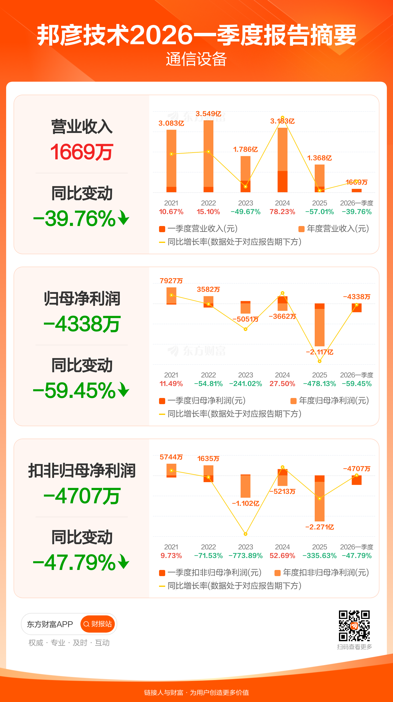 邦彦技术4月29日发布2026年一季报显示,公司一季度实现营业收入1668.99万元,同比下滑39.76%;归母净利润-4337.90万元;扣非归母净利润-4707.47万元。