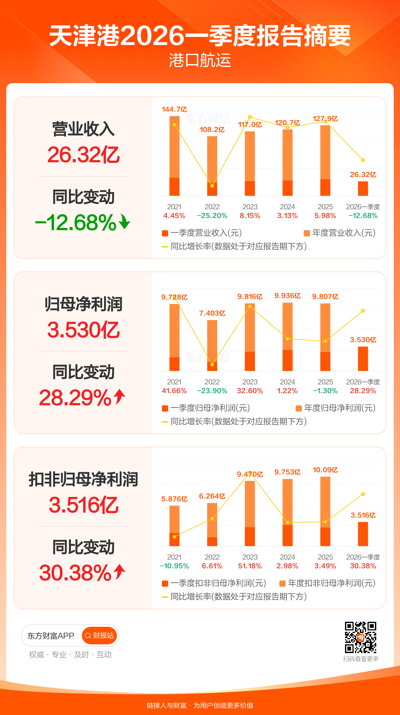 天津港4月29日发布2026年一季报显示,公司一季度实现营业收入26.32亿元,同比下滑12.68%;归母净利润3.53亿元,同比增长28.29%;扣非归母净利润3.52亿元,同比增长30.38%。