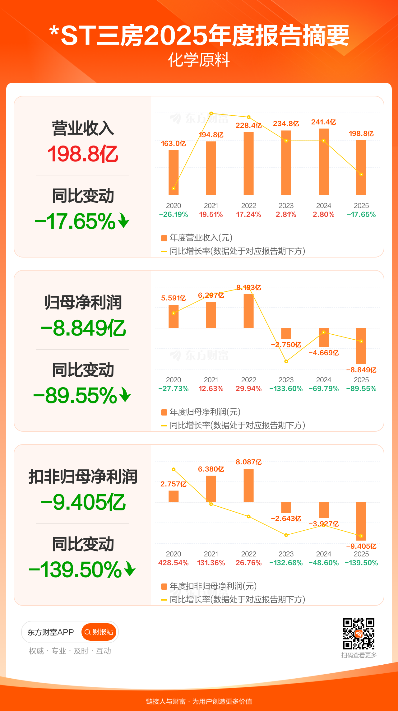 *ST三房4月29日发布2025年年报显示,公司全年实现营业收入198.77亿元,同比下滑17.65%;归母净利润-8.85亿元;扣非归母净利润-9.41亿元。