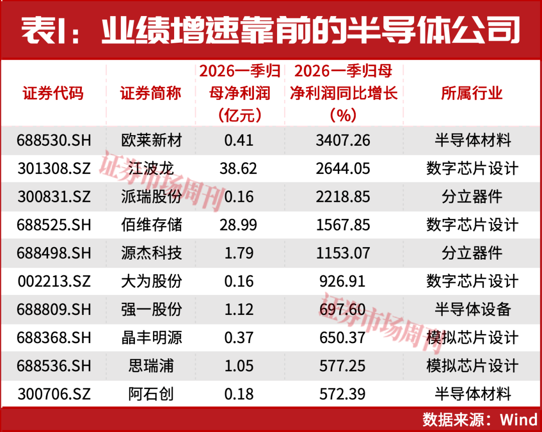 据笔者进一步梳理,目前申万半导体行业共有96家发布了2026年一季报,其中有33家实现了归母净利润超100%的同比增长,5家实现了超十倍的同比增长。