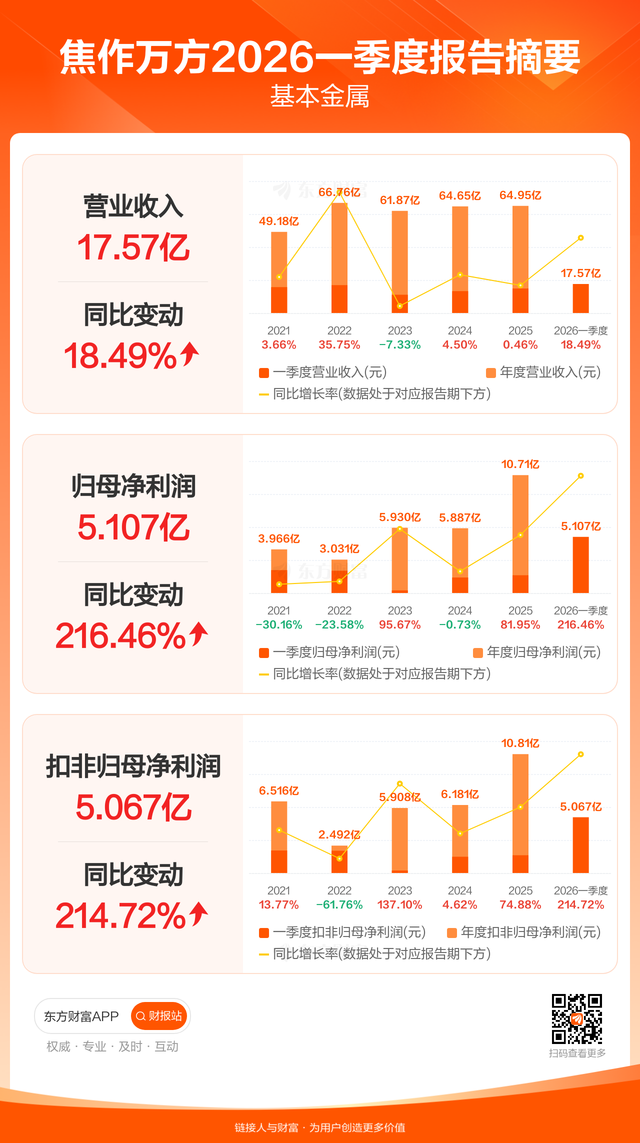 焦作万方4月29日发布2026年一季报显示,公司一季度实现营业收入17.57亿元,同比增长18.49%;归母净利润5.11亿元,同比增长216.46%;扣非归母净利润5.07亿元,同比增长214.72%。