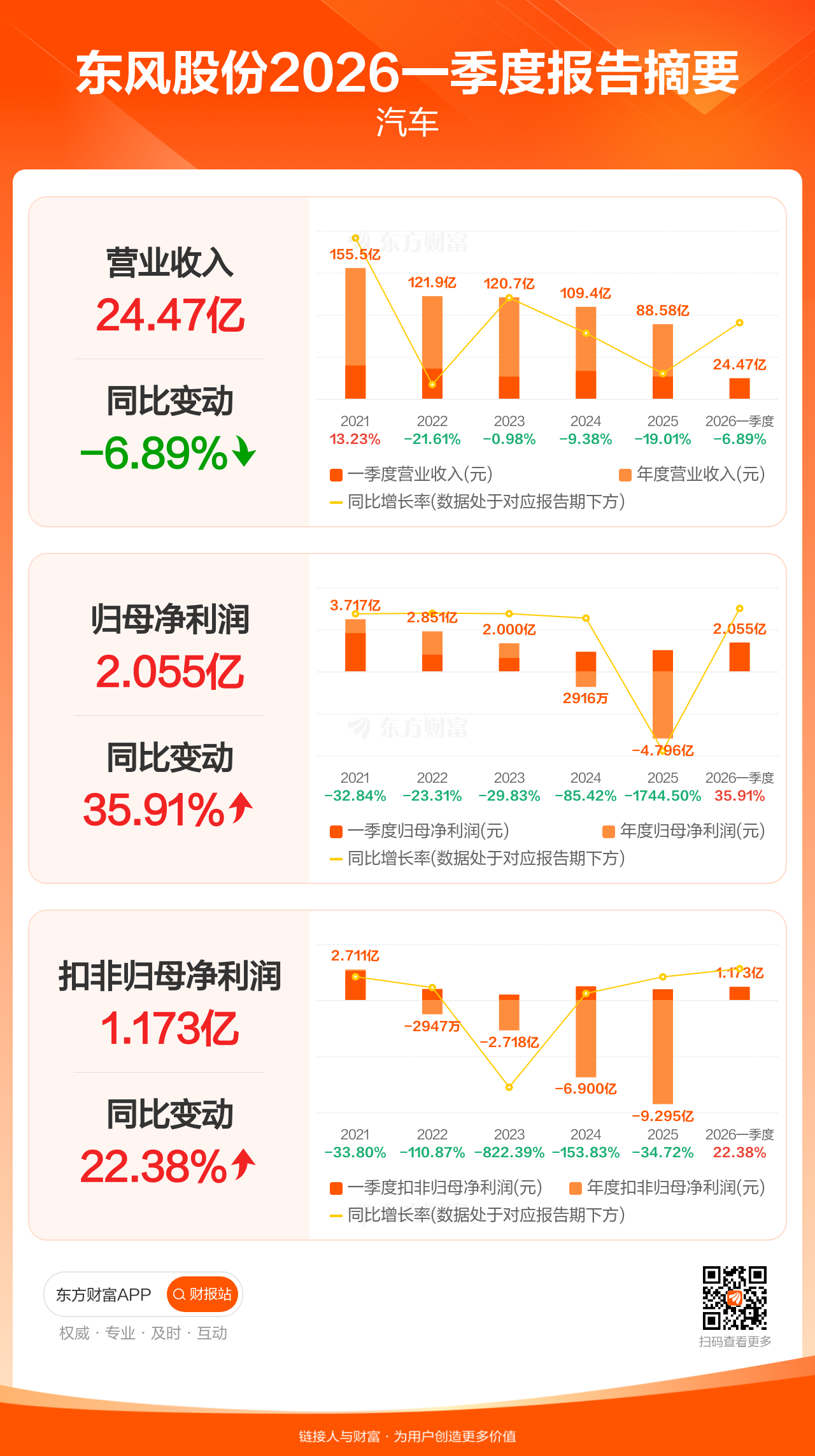 东风股份4月29日发布2026年一季报显示,公司一季度实现营业收入24.47亿元,同比下滑6.89%;归母净利润2.06亿元,同比增长35.91%;扣非归母净利润1.17亿元,同比增长22.38%。