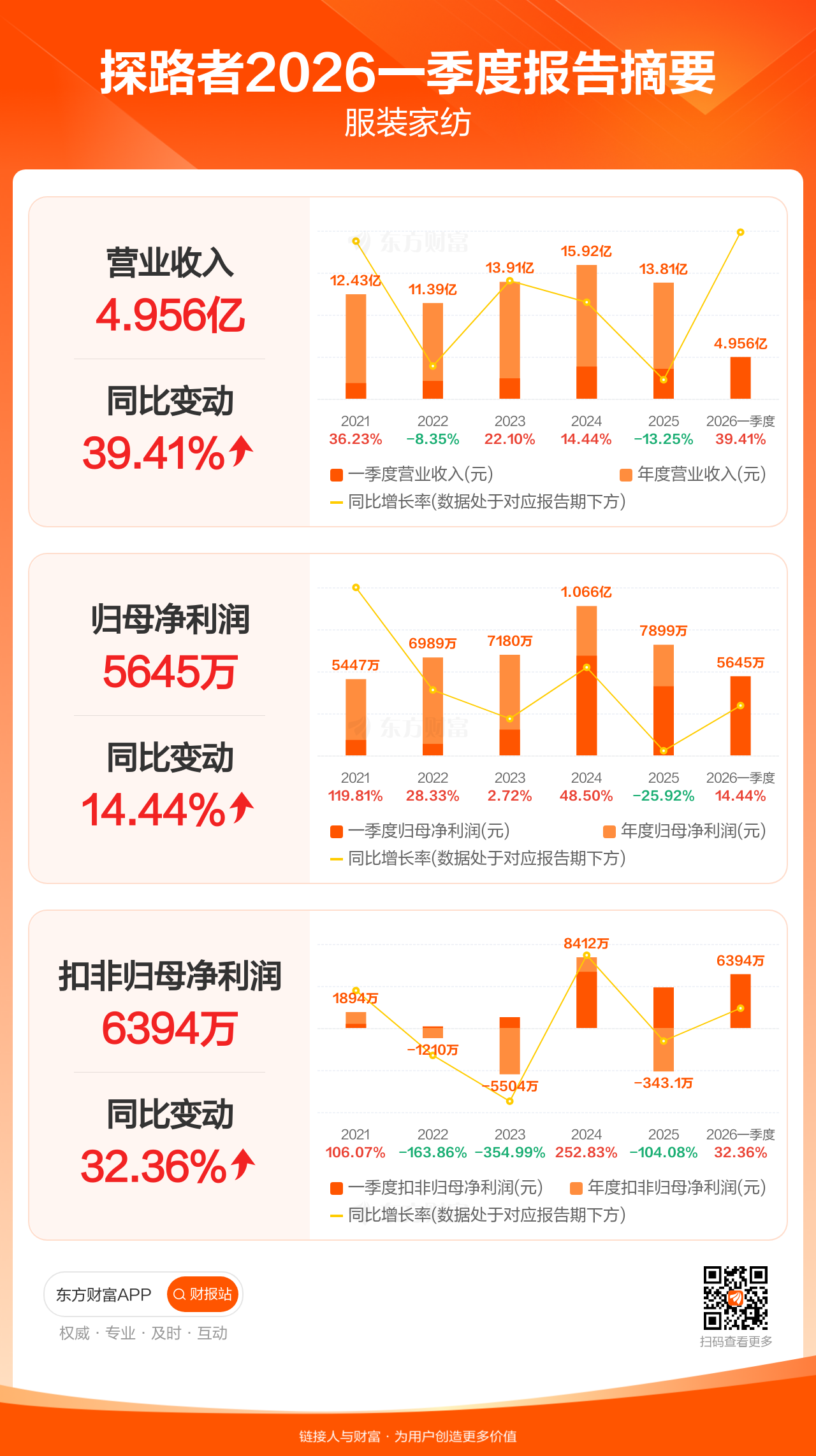 探路者4月29日发布2026年一季报显示,公司一季度实现营业收入4.96亿元,同比增长39.41%;归母净利润5644.57万元,同比增长14.44%;扣非归母净利润6393.95万元,同比增长32.36%。