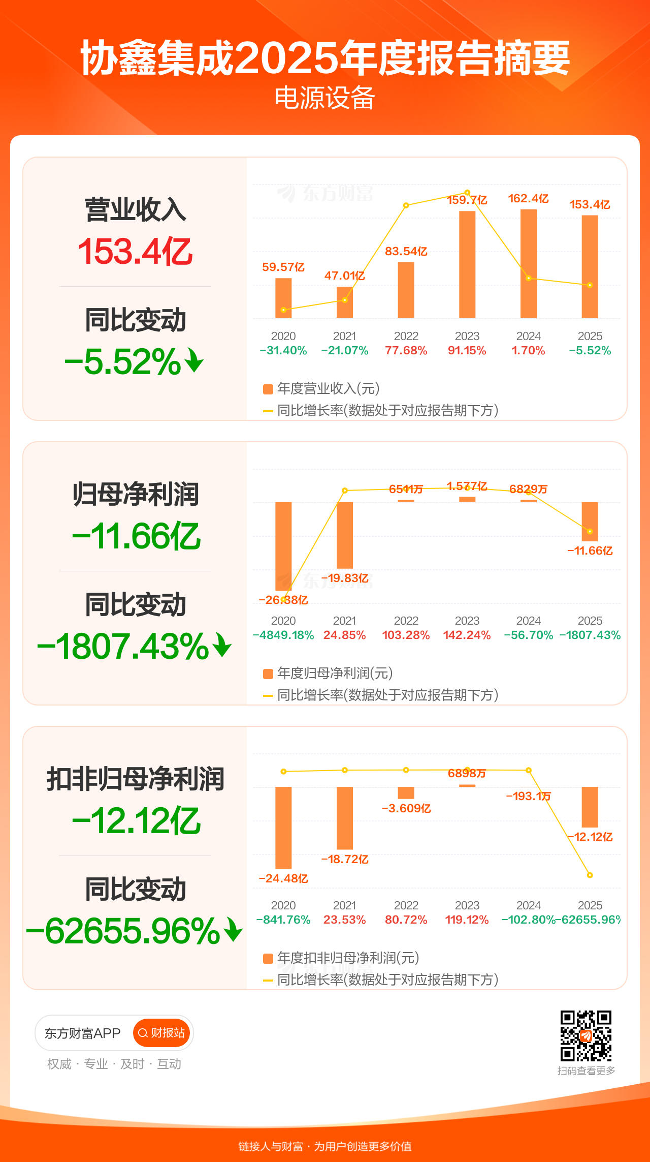 协鑫集成4月29日发布2025年年报显示,公司全年实现营业收入153.43亿元,同比下滑5.52%;归母净利润-11.66亿元;扣非归母净利润-12.12亿元。