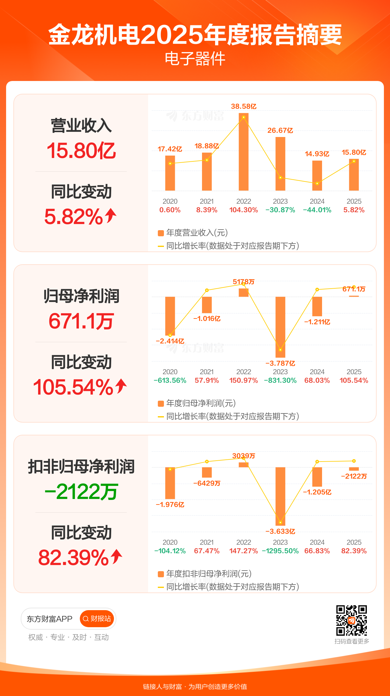 金龙机电4月29日发布2025年年报显示,公司全年实现营业收入15.80亿元,同比增长5.82%;归母净利润671.10万元,同比增长105.54%;扣非归母净利润-2121.92万元。