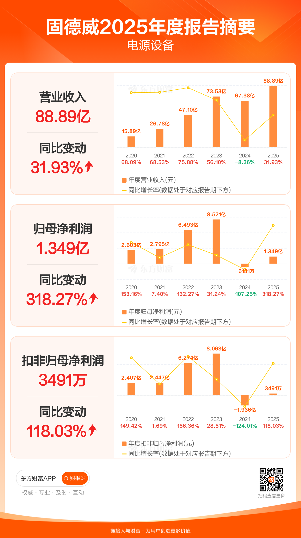 固德威4月29日发布2025年年报显示,公司全年实现营业收入88.89亿元,同比增长31.93%;归母净利润1.35亿元,同比增长318.27%;扣非归母净利润3490.52万元,同比增长118.03%。