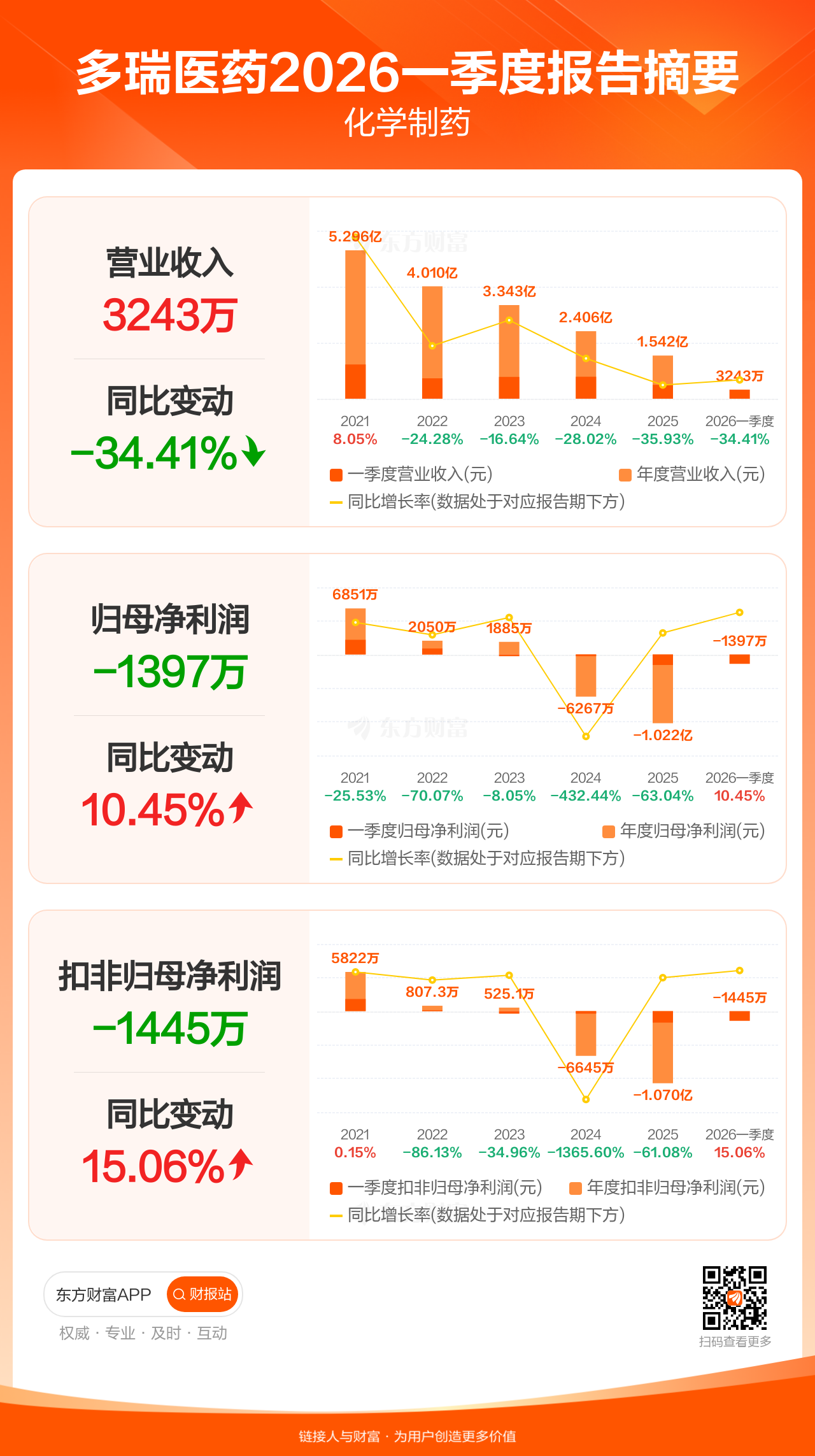 多瑞医药4月29日发布2026年一季报显示,公司一季度实现营业收入3243.12万元,同比下滑34.41%;归母净利润-1396.80万元;扣非归母净利润-1444.70万元。