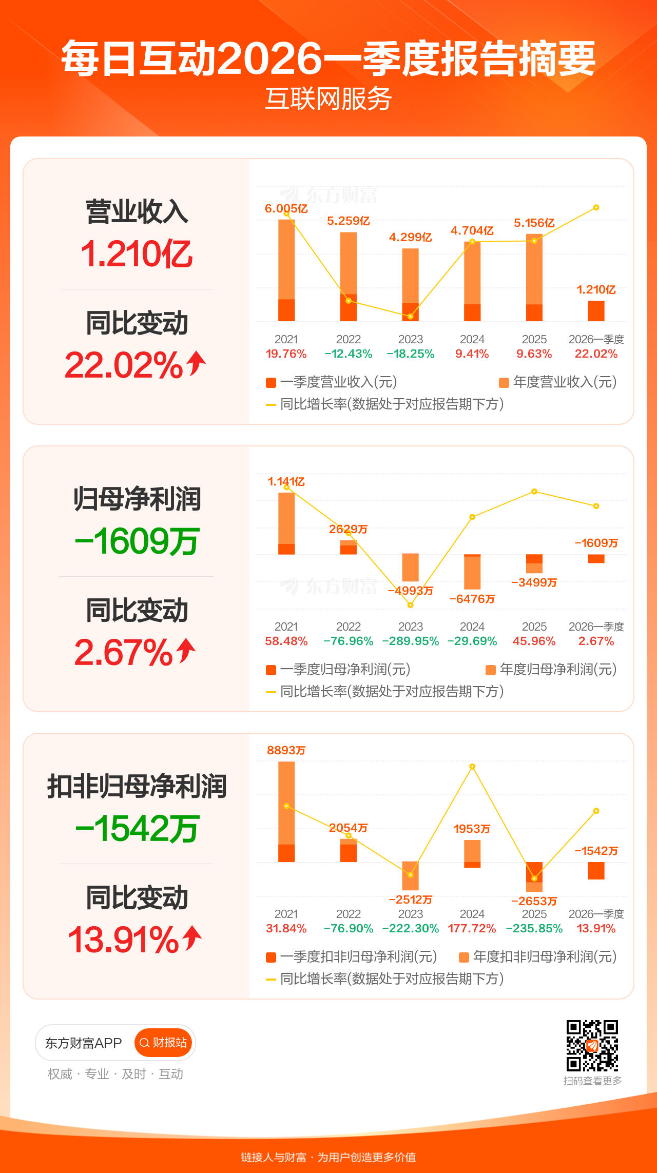 每日互动4月29日发布2026年一季报显示,公司一季度实现营业收入1.21亿元,同比增长22.02%;归母净利润-1609.18万元;扣非归母净利润-1541.91万元。