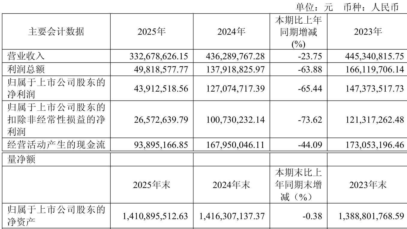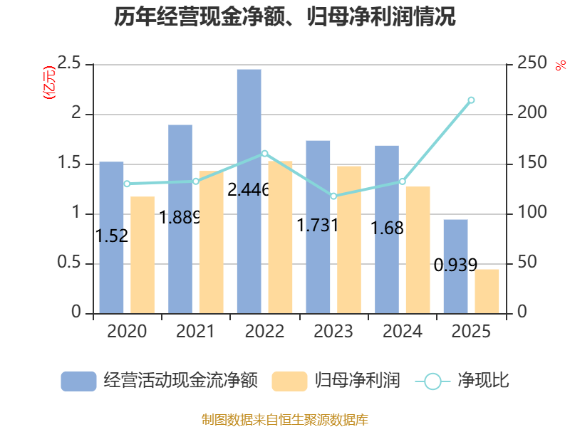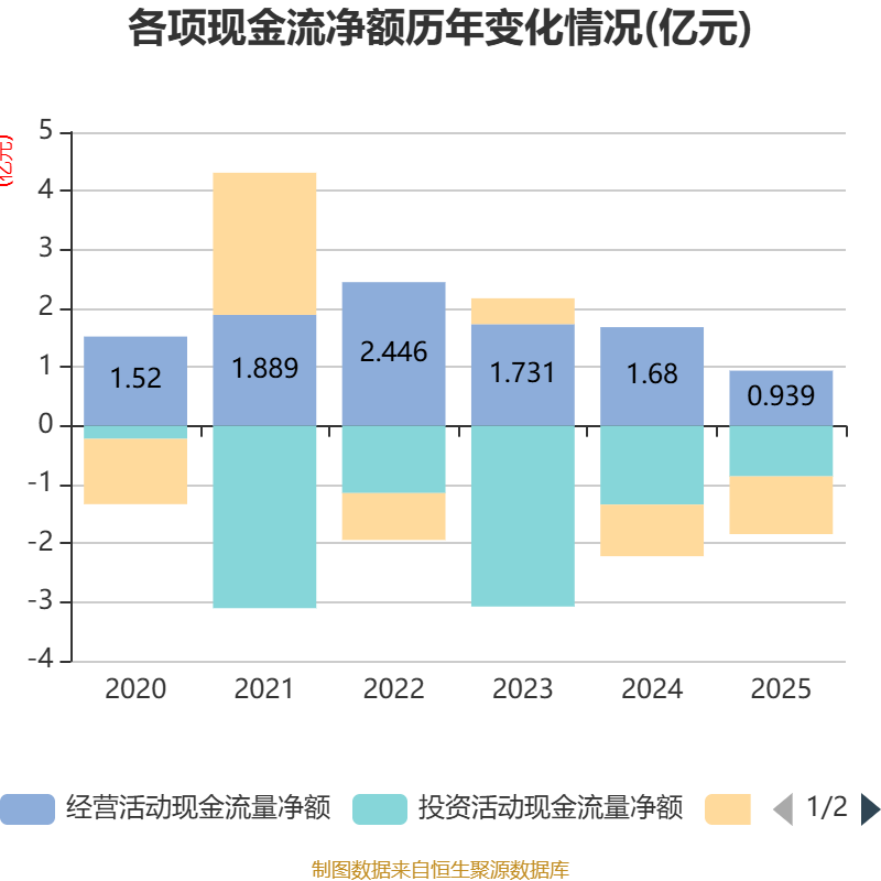截至2025年,公司经营活动现金流净额为9389.52万元,同比下降44.09%;筹资活动现金流净额-9829.58万元,同比减少1036.37万元;投资活动现金流净额-8614.13万元,上年同期为-1.34亿元。