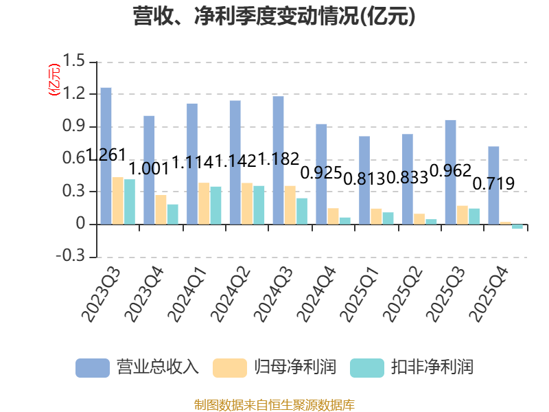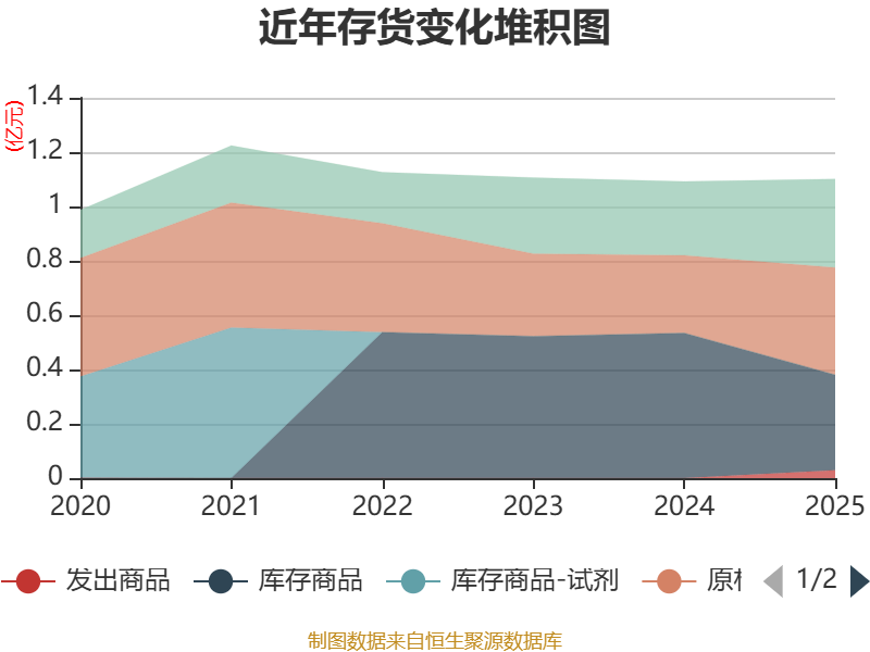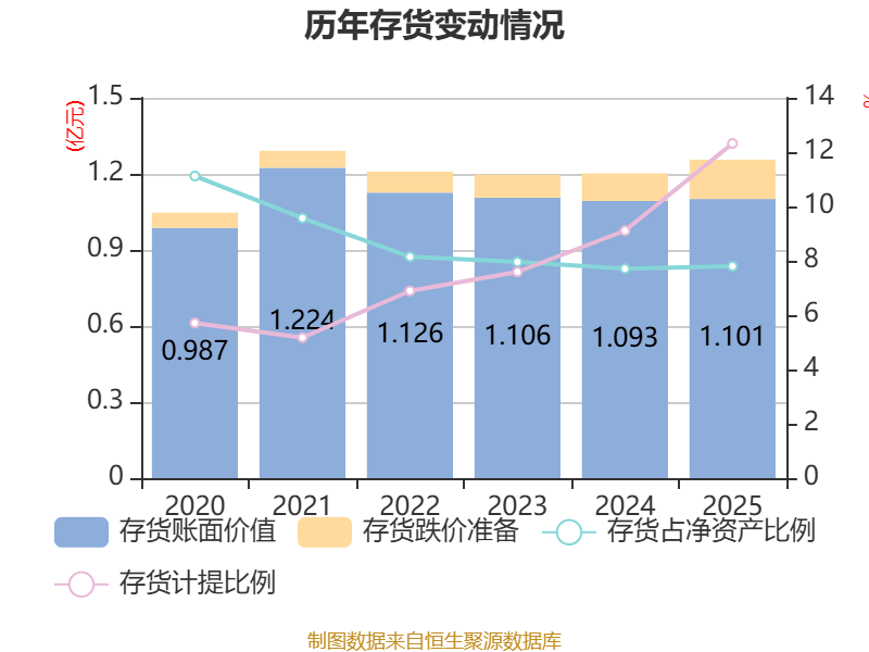 从存货变动来看,截至2025年末,公司存货账面价值为1.1亿元,占净资产的7.8%,较上年末增加79.38万元。其中,存货跌价准备为1546.24万元,计提比例为12.32%。