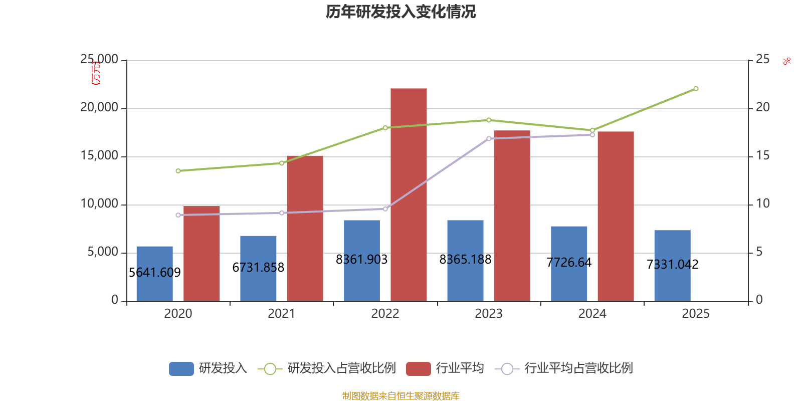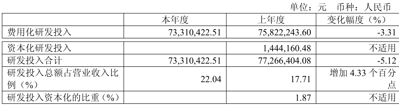 2025年全年,公司研发投入金额为7331.04万元,同比下降5.12%;研发投入占营业收入比例为22.04%,相比上年同期上升4.33个百分点。