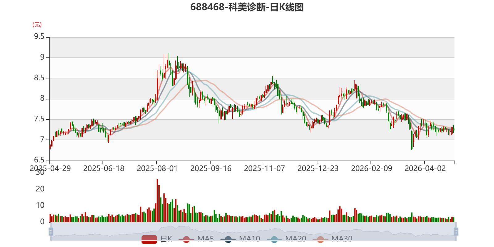 中证智能财讯科美诊断(688468)4月29日披露2025年年度报告。2025年,公司实现营业总收入3.33亿元,同比下降23.75%;归母净利润4391.25万元,同比下降65.44%;扣非净利润2657.26万元,同比下降73.62%;经营活动产生的现金流量净额为9389.52万元,同比下降44.09%;报告期内,科美诊断基本每股收益为0.11元,加权平均净资产收益率为3.12%。