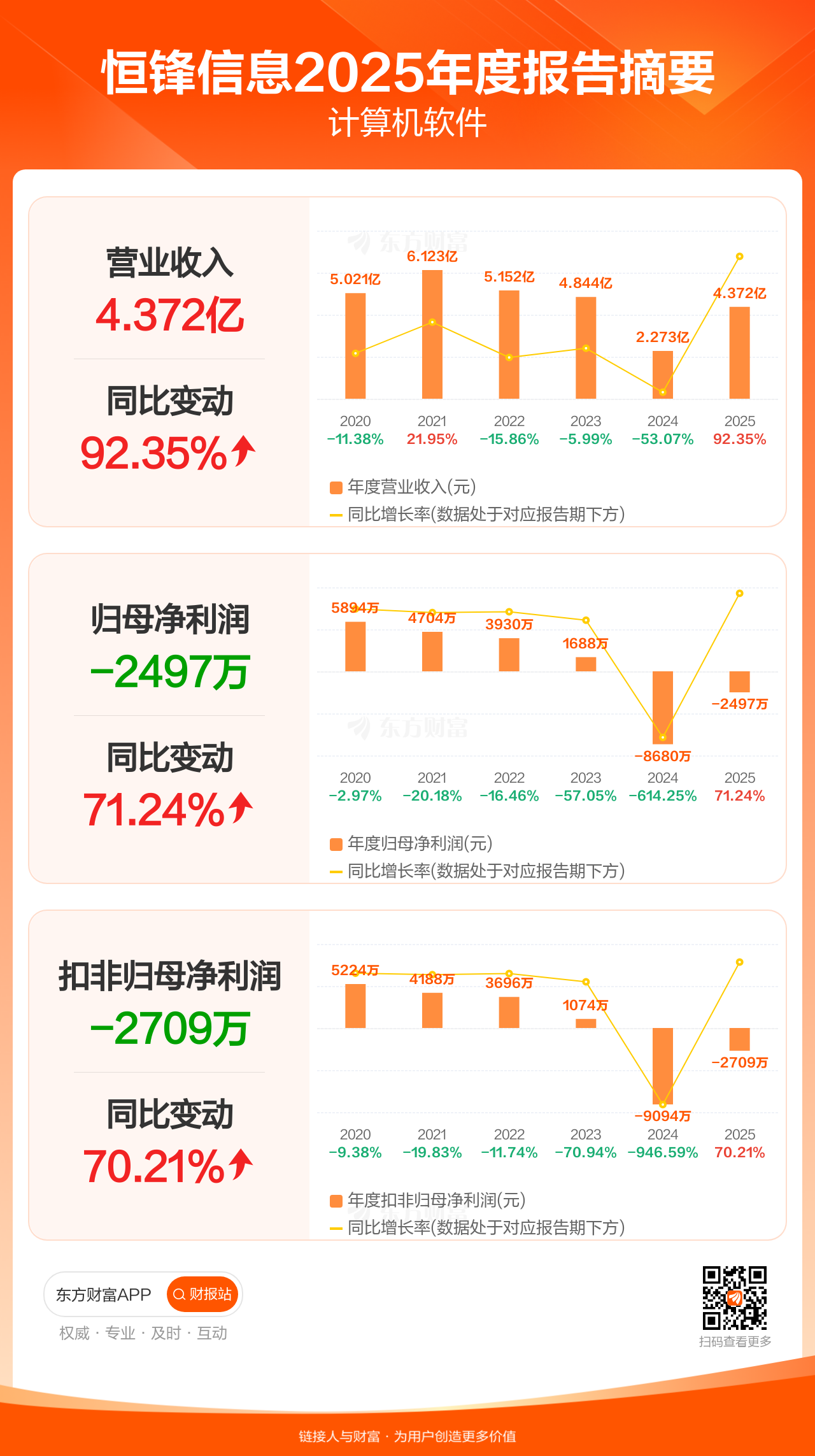恒锋信息4月29日发布2025年年报显示,公司全年实现营业收入4.37亿元,同比增长92.35%;归母净利润-2496.72万元;扣非归母净利润-2709.32万元。