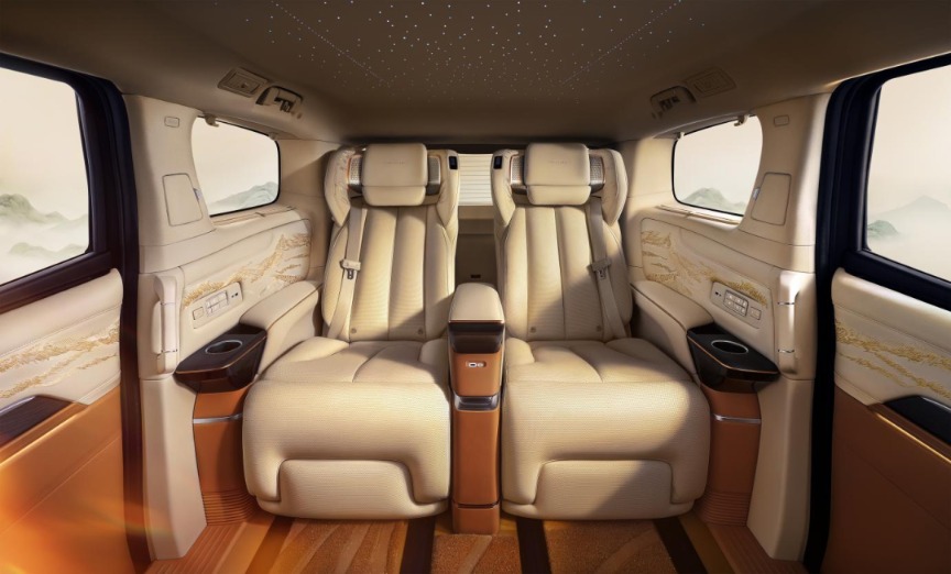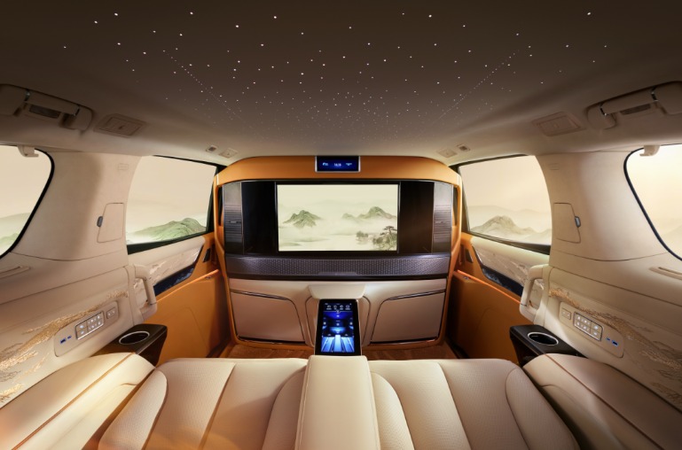 私密空间方面,全隔断智慧幕墙搭载32英寸可升降智能屏,支持全屏、半屏无缝切换,一键实现全封闭私密与通透交互转换。屏幕集成前车实况实时显示、13升车载冰箱、定制陶瓷香氛系统与Cabin talk前后舱对讲系统。Bose首款后排优先悦尊音响系统配备21只扬声器,座椅头枕内置超近场扬声器,打造专属移动音乐厅。座舱内以136,092针“江山如画”鎏金刺绣打造环抱式山水座舱,15毫米进口鎏金羊毛地毯与星河绣帷星空顶棚(366颗星星,8大星空模式)共同营造“人在车中坐,如在画中游”的沉浸体验。