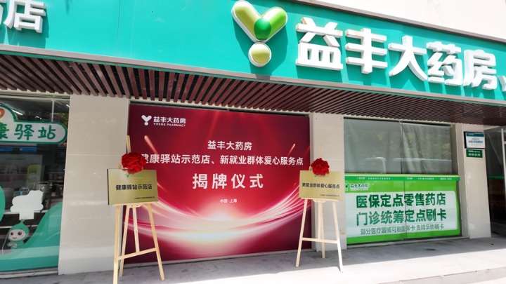 在上海市国和路益丰大药房门口,“健康驿站”的标识格外醒目。进门处的服务专区,茶水、微波炉、爱心雨伞、血压计等设备整齐摆放。靠窗的休息区里,几位老年居民正在服务台前测量血糖,药师在一旁耐心讲解慢性病早防知识。